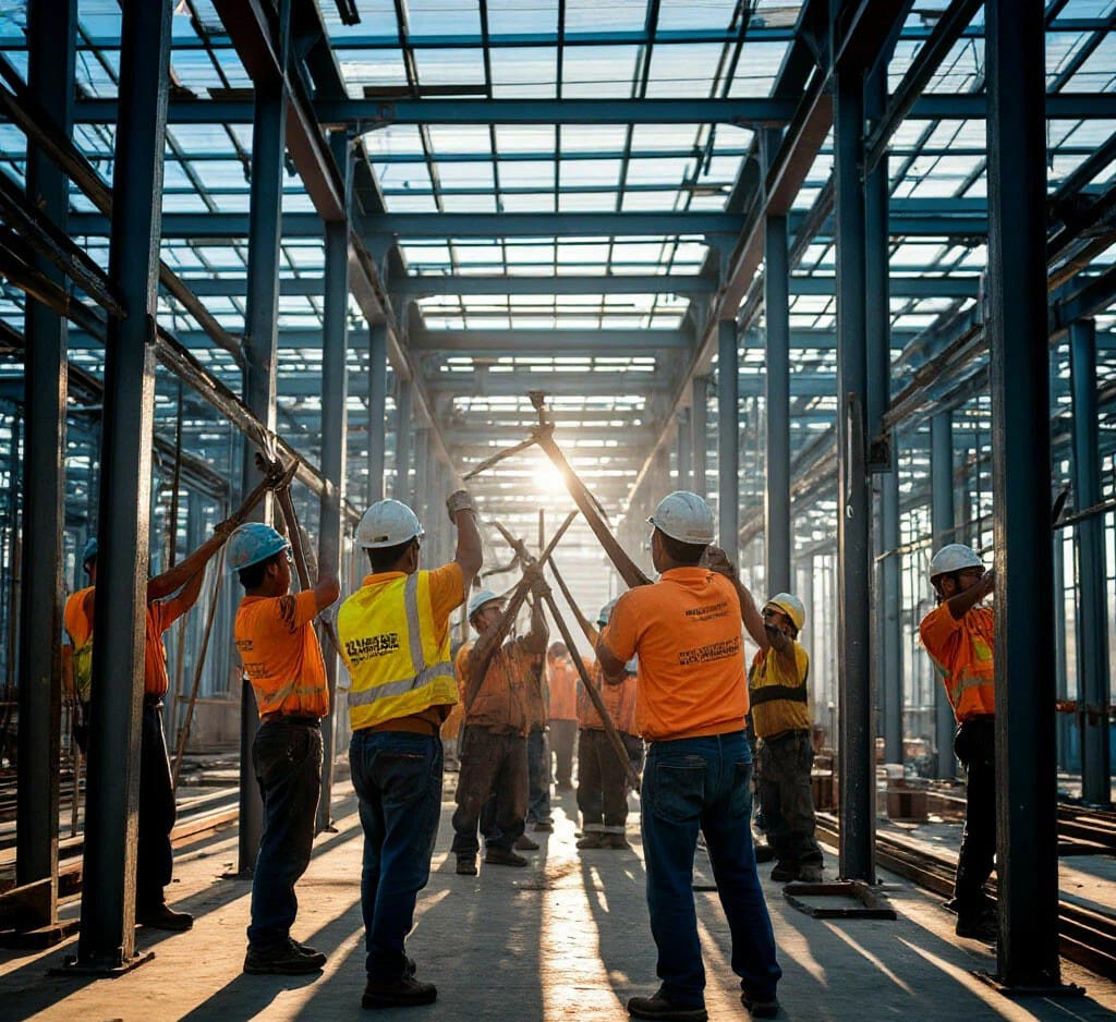 - Сборка и установка: монтаж колонн, балок, ферм, связей.