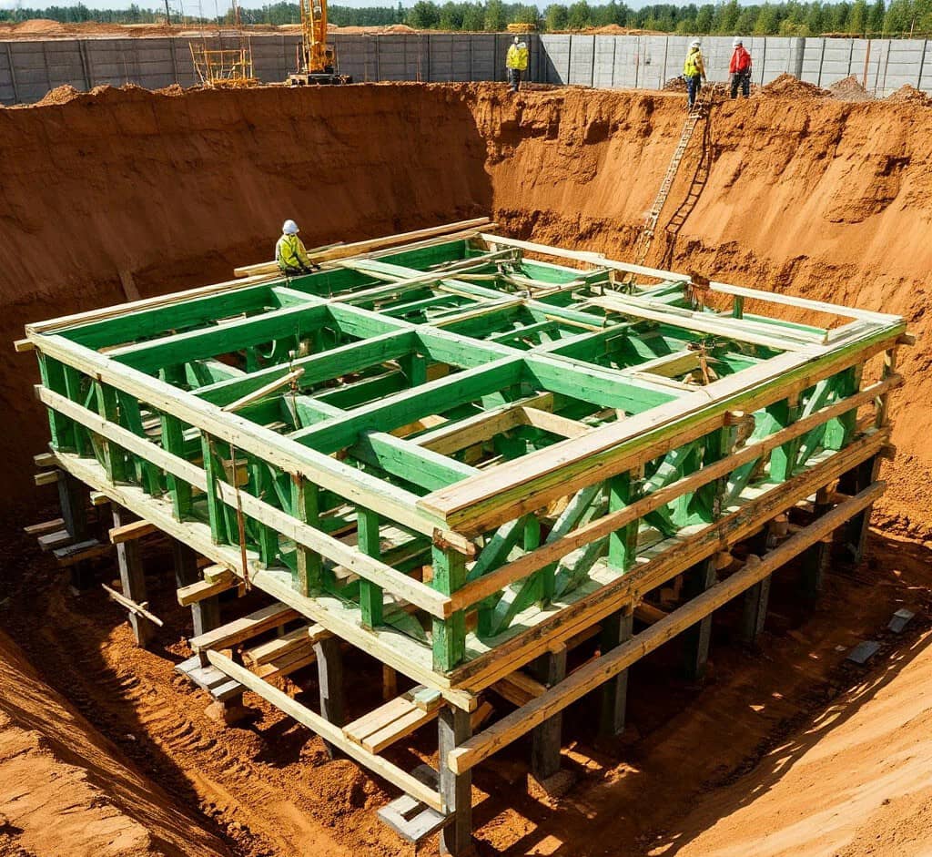 -Подготовка основания: выемка грунта, уплотнение, установка гидроизоляции